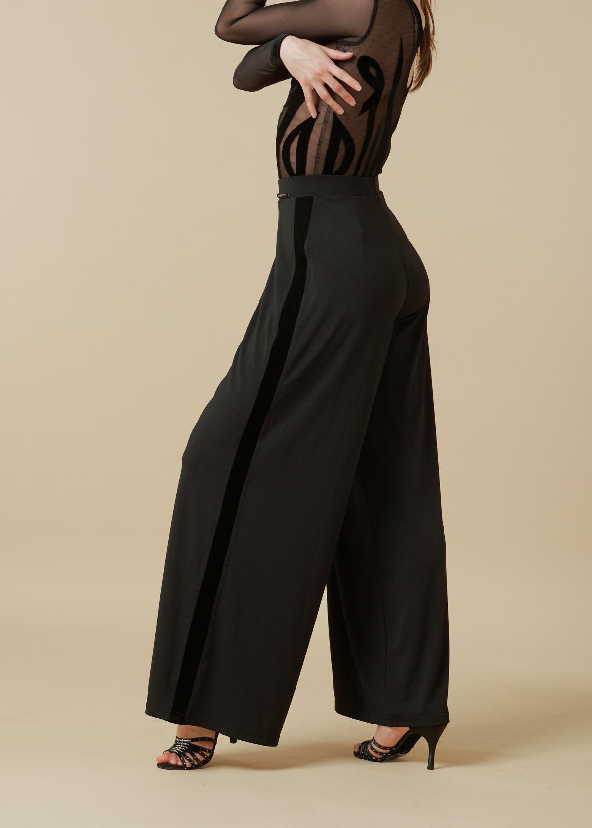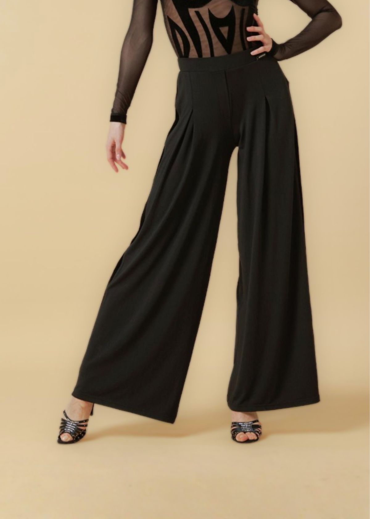 Посадка висока, що забезпечує комфортну підтримку талії та плавний перехід силуету. Широкий крій штанин додає легкості та свободи в кожному русі, створюючи ефект плавного ковзання по паркету. Завдяки еластичності тканини брюки ідеально сідають по фігурі, не обмежуючи рухливість.