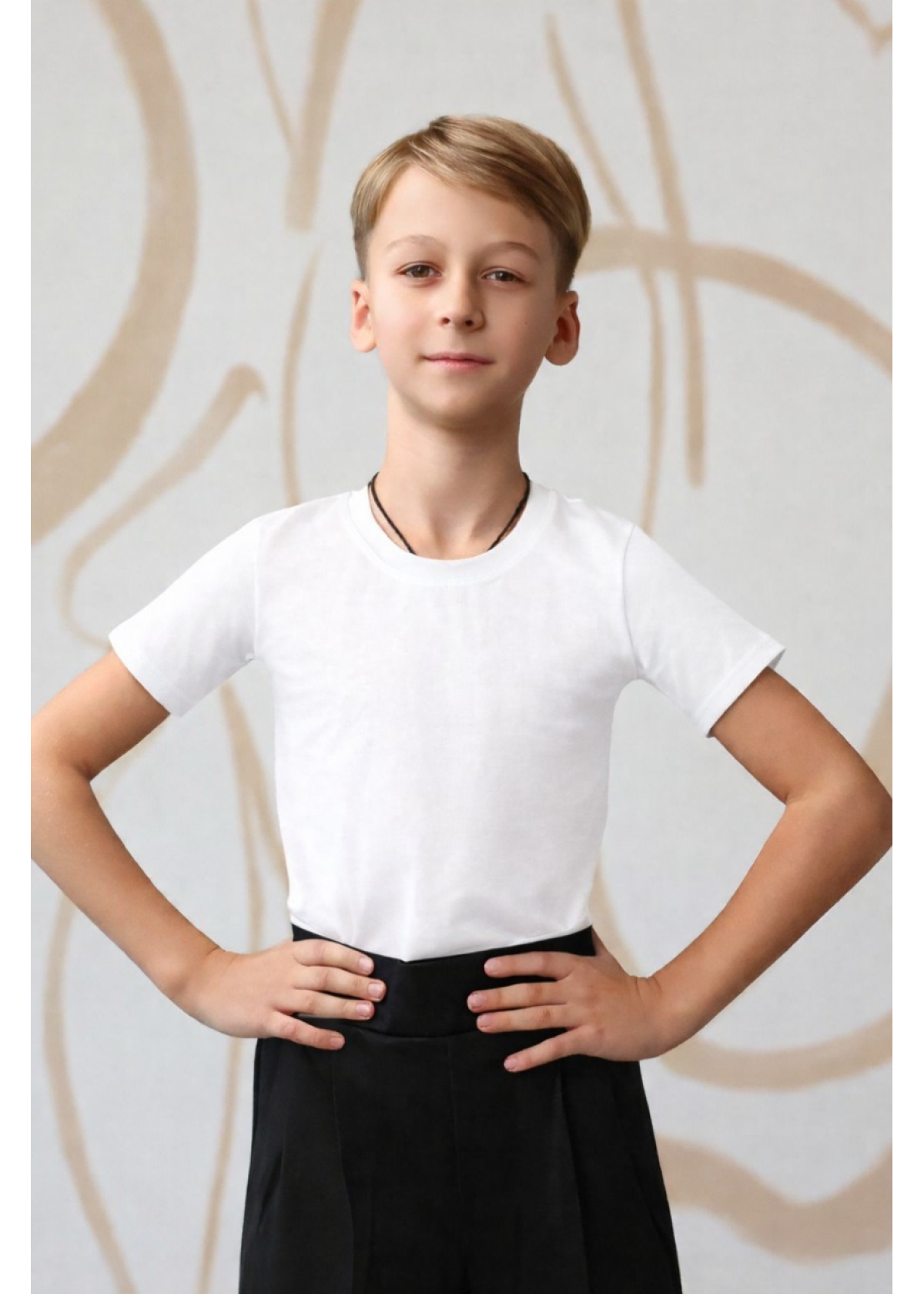 Класична футболка для хлопців, які займаються хореографією, балетом або спортивною гімнастикою. Завдяки еластичному трикотажу на основі бавовни футболка м’яко облягає тіло, не сковує рухів і забезпечує комфорт під час занять. Акуратний круглий виріз і базовий крій роблять її зручною та універсальною частиною гардеробу для тренувань або виступів.