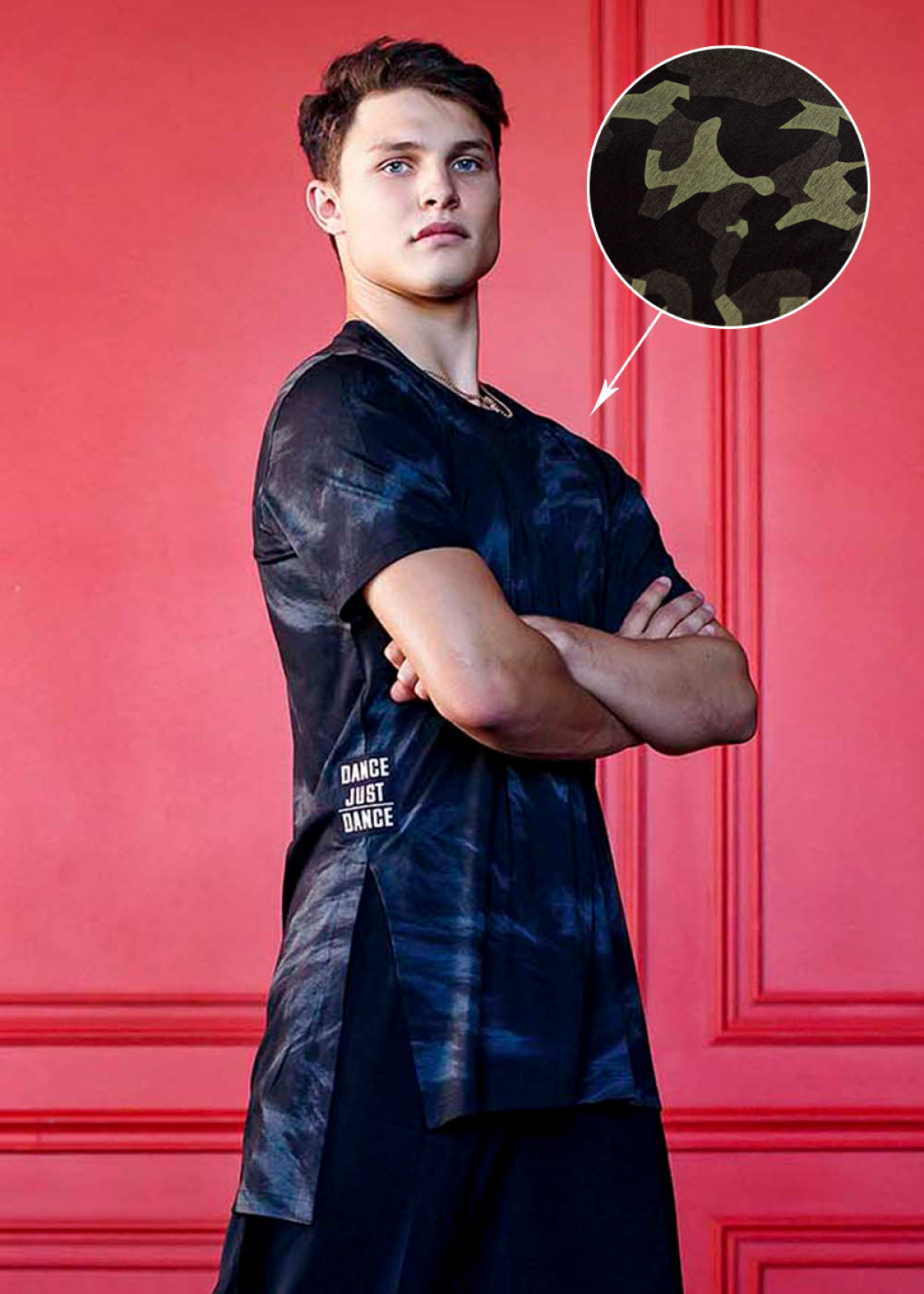 Чоловіча футболка з актуальним принтом тай-дай та надписом DANCE JUST DANCE на боці. Подовжений крій з розрізами з боків забезпечує свободу руху. Натуральна бавовна з еластаном робить її зручною для занять танцями, тренувань або активного дозвілля.