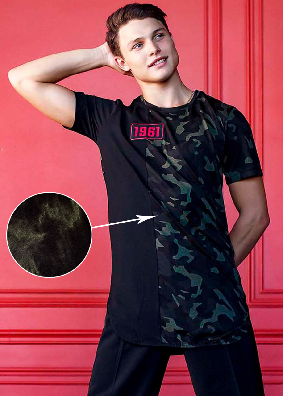 Чоловіча футболка з асиметричним дизайном і камуфляжною вставкою. Модель виконана з м’якого трикотажу на основі бавовни з додаванням еластану — забезпечує комфорт, свободу рухів і зберігає форму після прання. Ідеально підходить для занять спортом, танцями або повсякденного стилю.