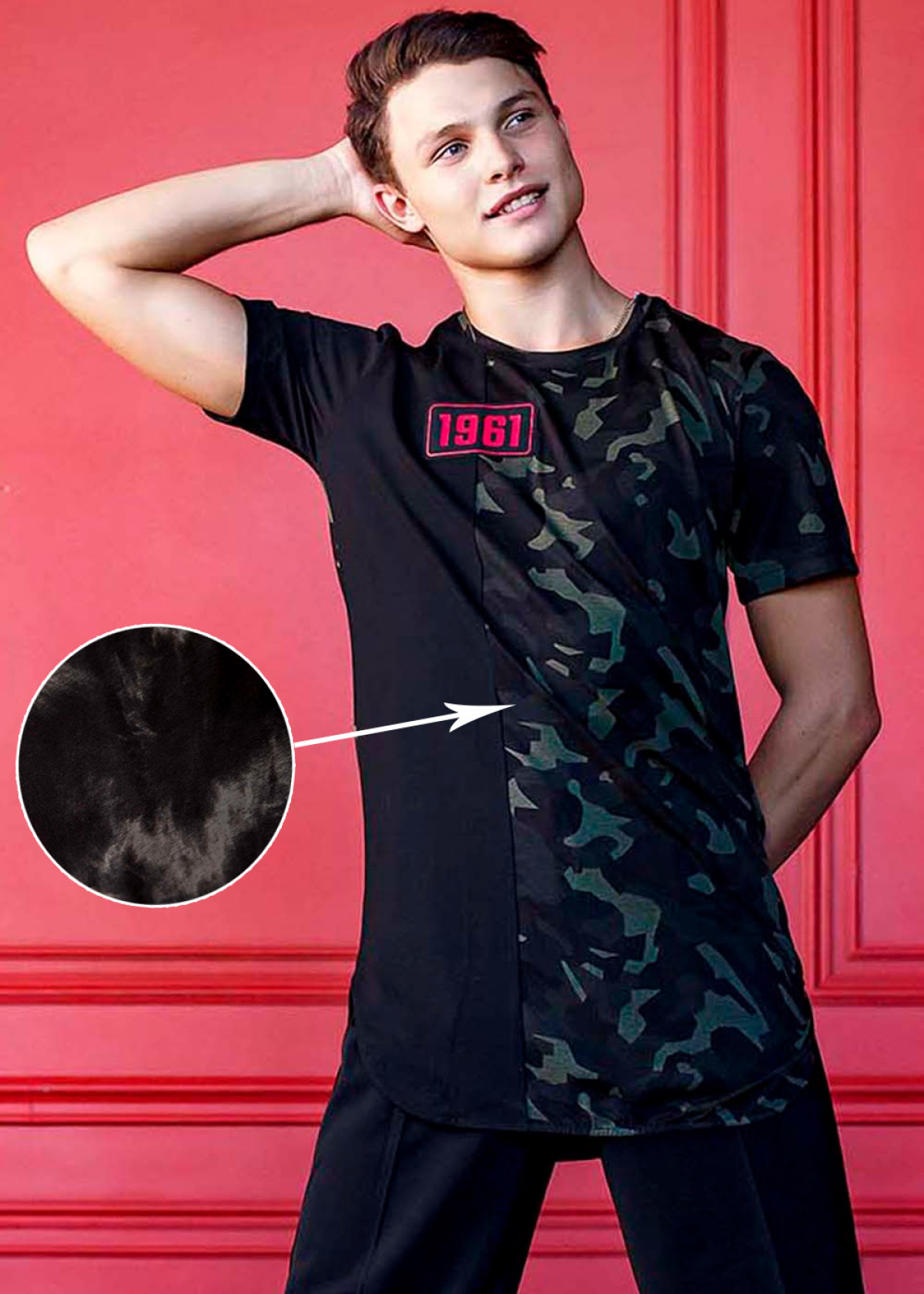 Чоловіча футболка з асиметричним дизайном і камуфляжною вставкою. Модель виконана з м’якого трикотажу на основі бавовни з додаванням еластану — забезпечує комфорт, свободу рухів і зберігає форму після прання. Ідеально підходить для занять спортом, танцями або повсякденного стилю.