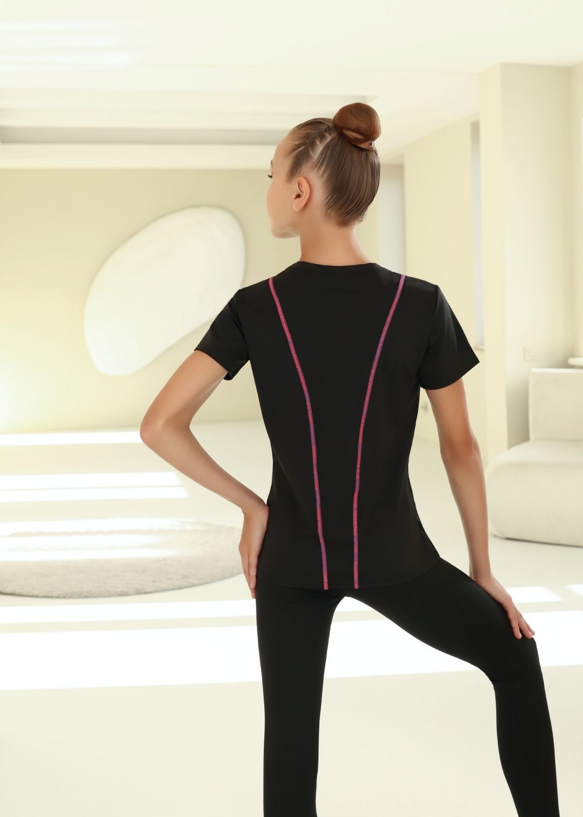 Головною візуальною особливістю є вигнута контрастна лінія на грудях, яка гармонійно повторюється на спинці у вигляді двох вертикальних швів. Така конструкція надає моделі балансу, візуально структурує силует і підкреслює фігуру. Футболка має класичний округлий виріз і прямий крій, що дозволяє легко поєднувати її з будь-яким низом з колекції GALAXY.