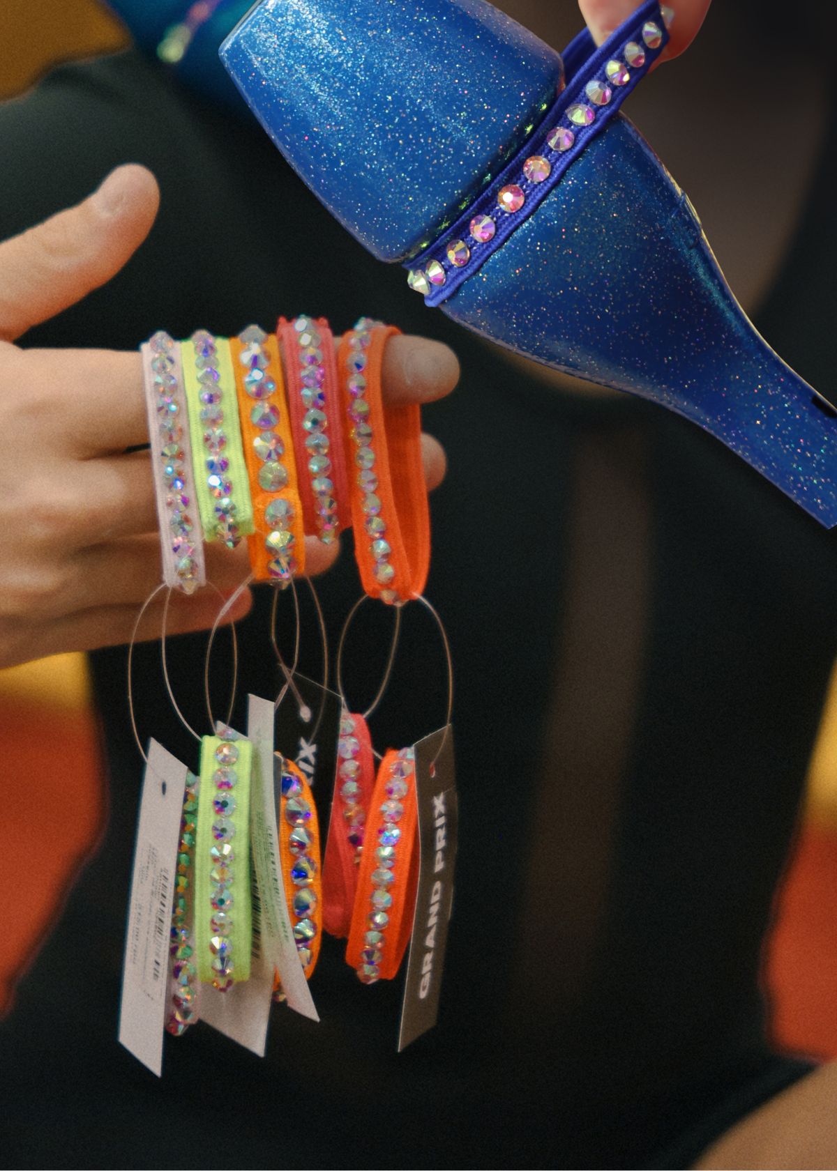 Ці резинки прикрашені камінням розміру SS20 (приблизно 4,8 мм) і використовуються як стильний декор для гімнастичних булав. Вони не лише додають блиску образу, а й візуально об’єднують снаряди в пару. Еластичні, надійні та виразні – чудовий вибір для виступу або фотосесії