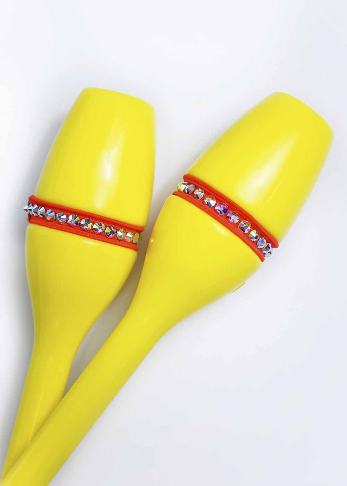 Ці резинки прикрашені камінням розміру SS20 (приблизно 4,8 мм) і використовуються як стильний декор для гімнастичних булав. Вони не лише додають блиску образу, а й візуально об’єднують снаряди в пару. Еластичні, надійні та виразні – чудовий вибір для виступу або фотосесії