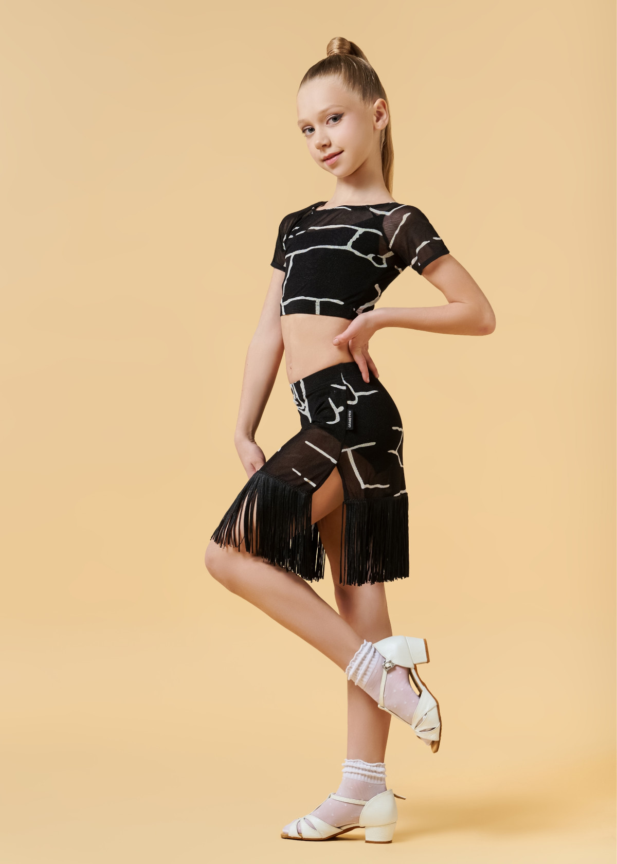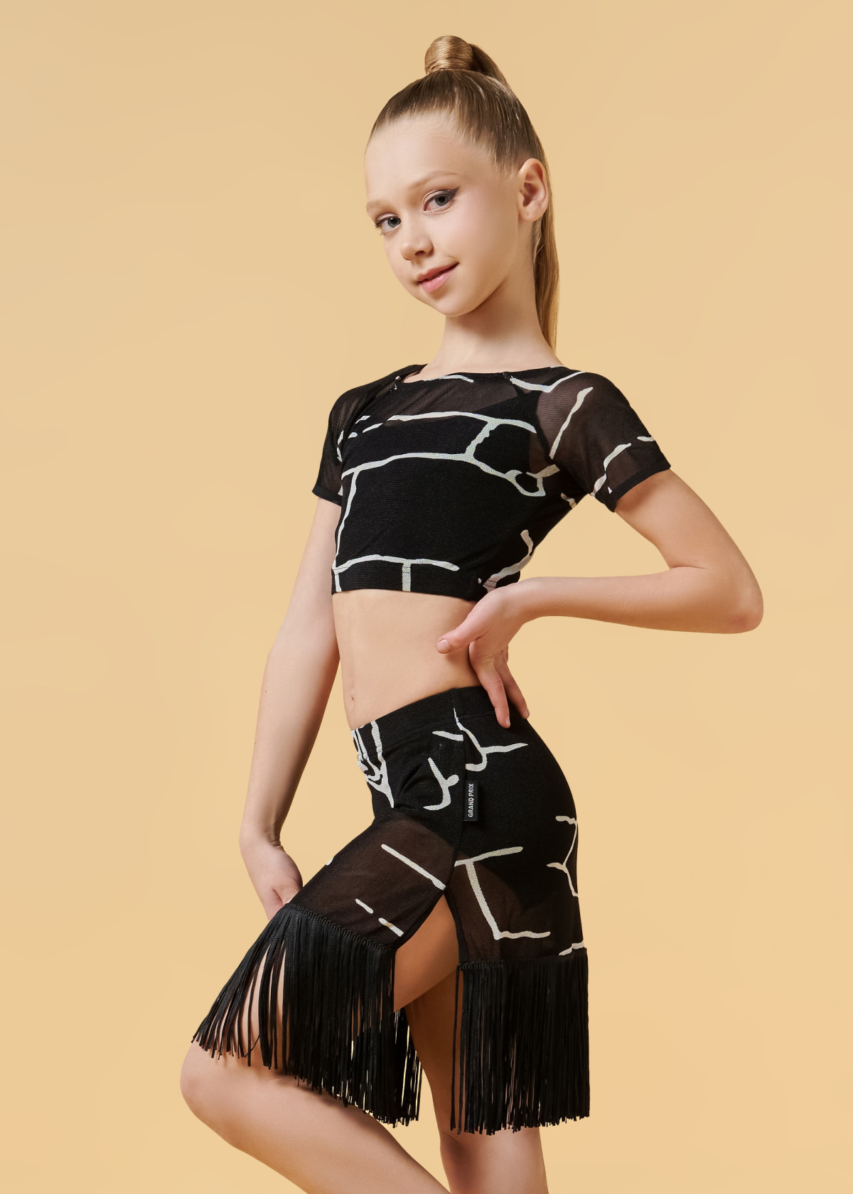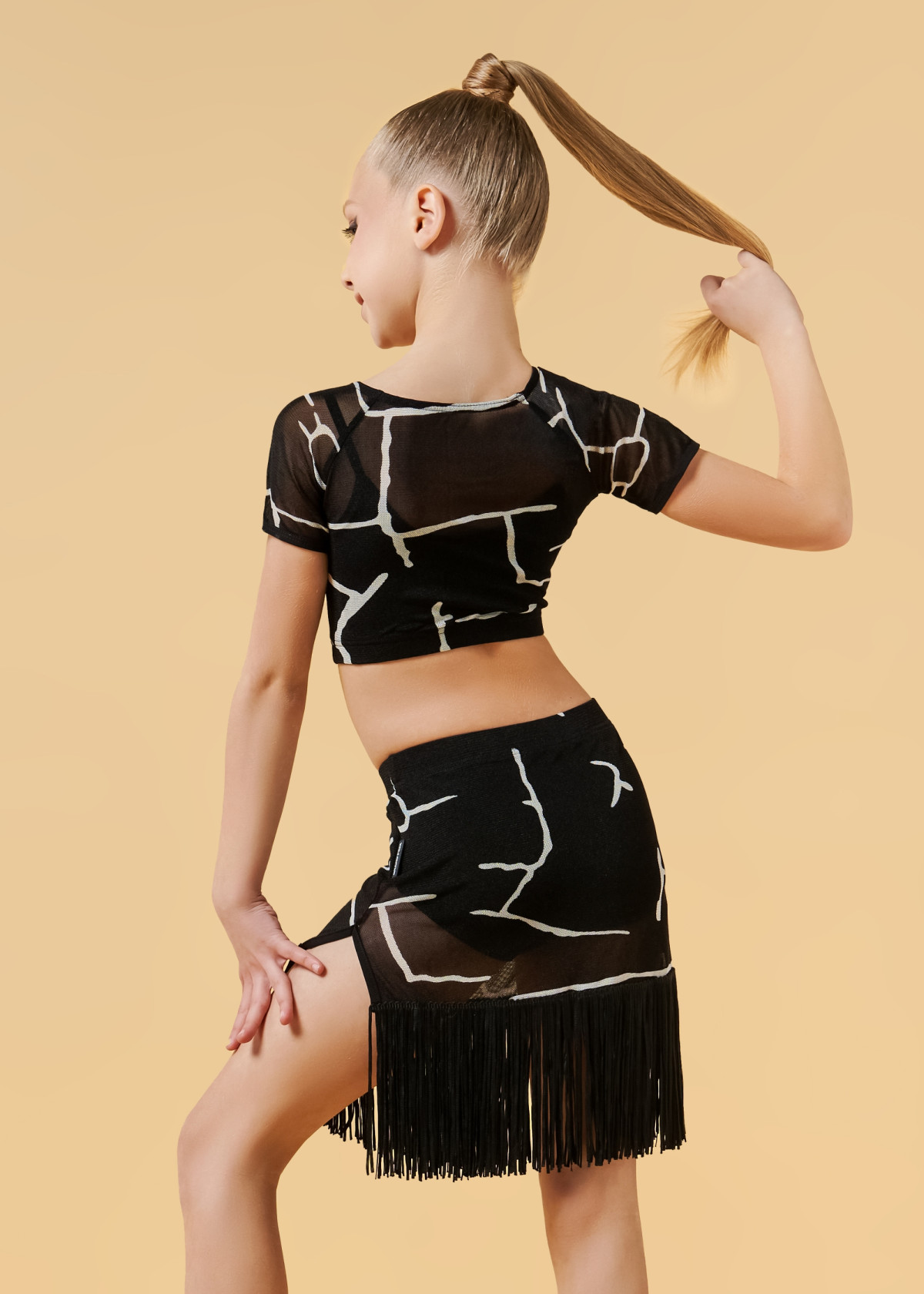Комплект RUMOR з колекції FANCY DANCY — яскраве рішення для тренувань і сценічних виступів. Складається з короткого топа та спідниці з бахромою, що створює динаміку та акцентує рухи під час танцю.
