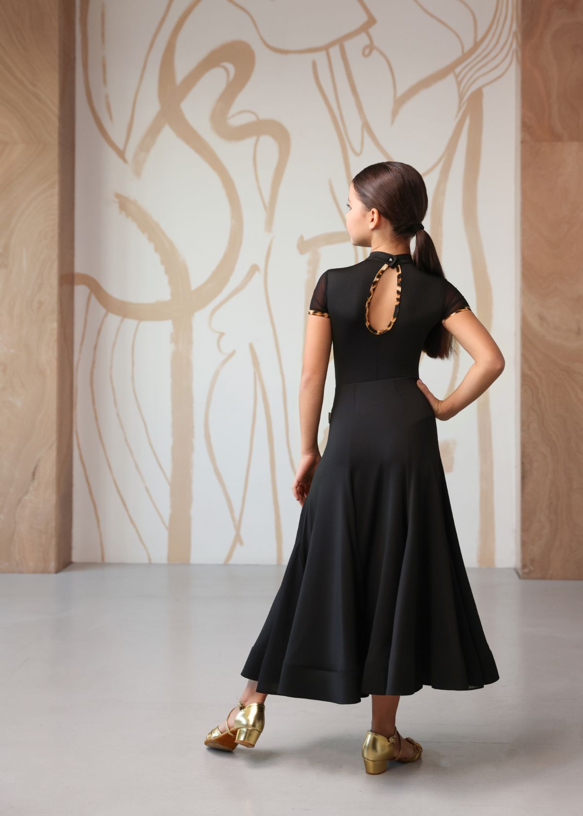 Леопардова оздоба в зоні грудей і на рукавах формує акцентну лінію, а напівпрозора кокетка привертає увагу до верхньої частини фігури.