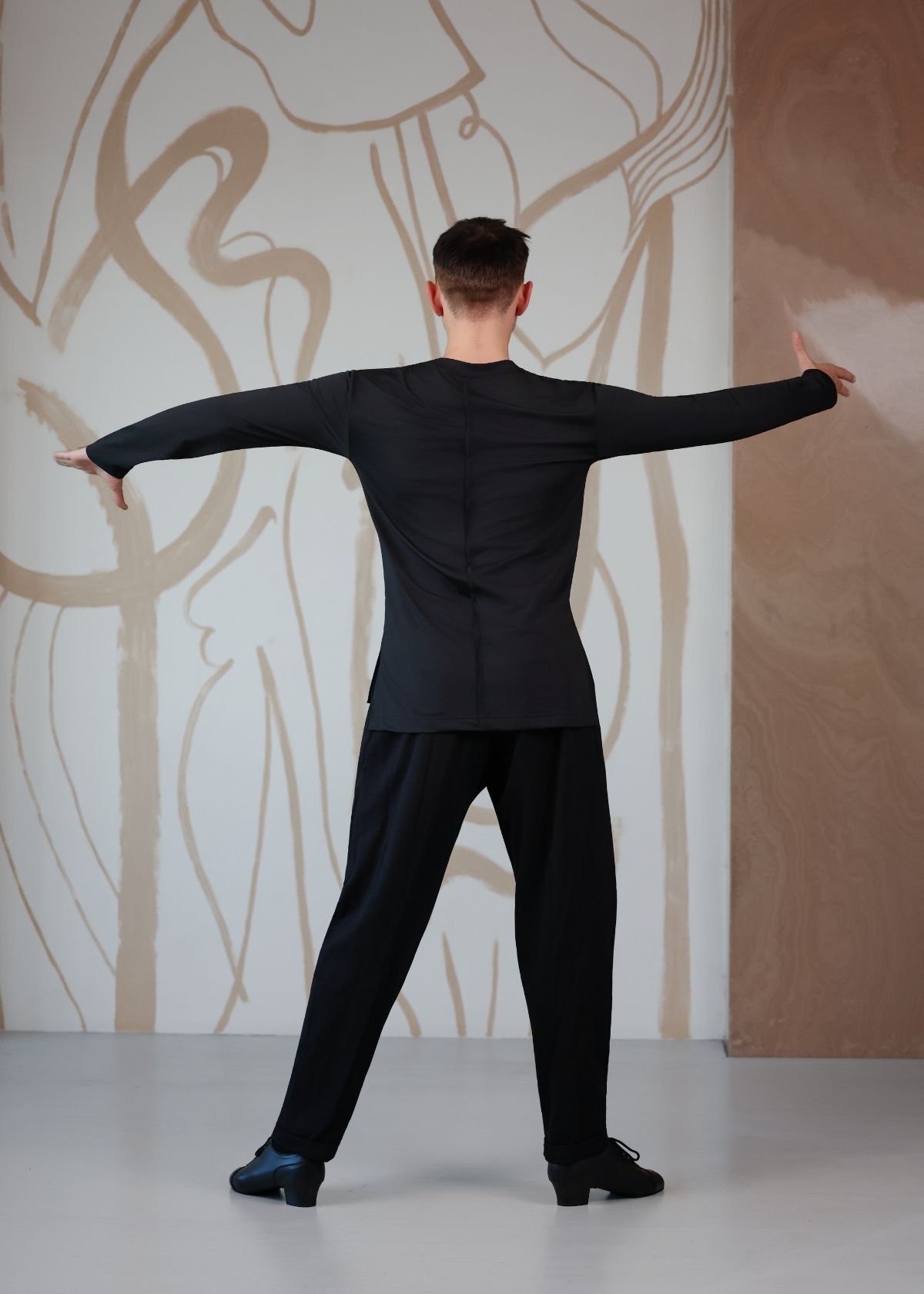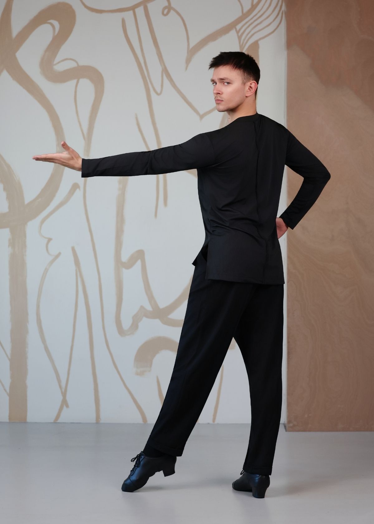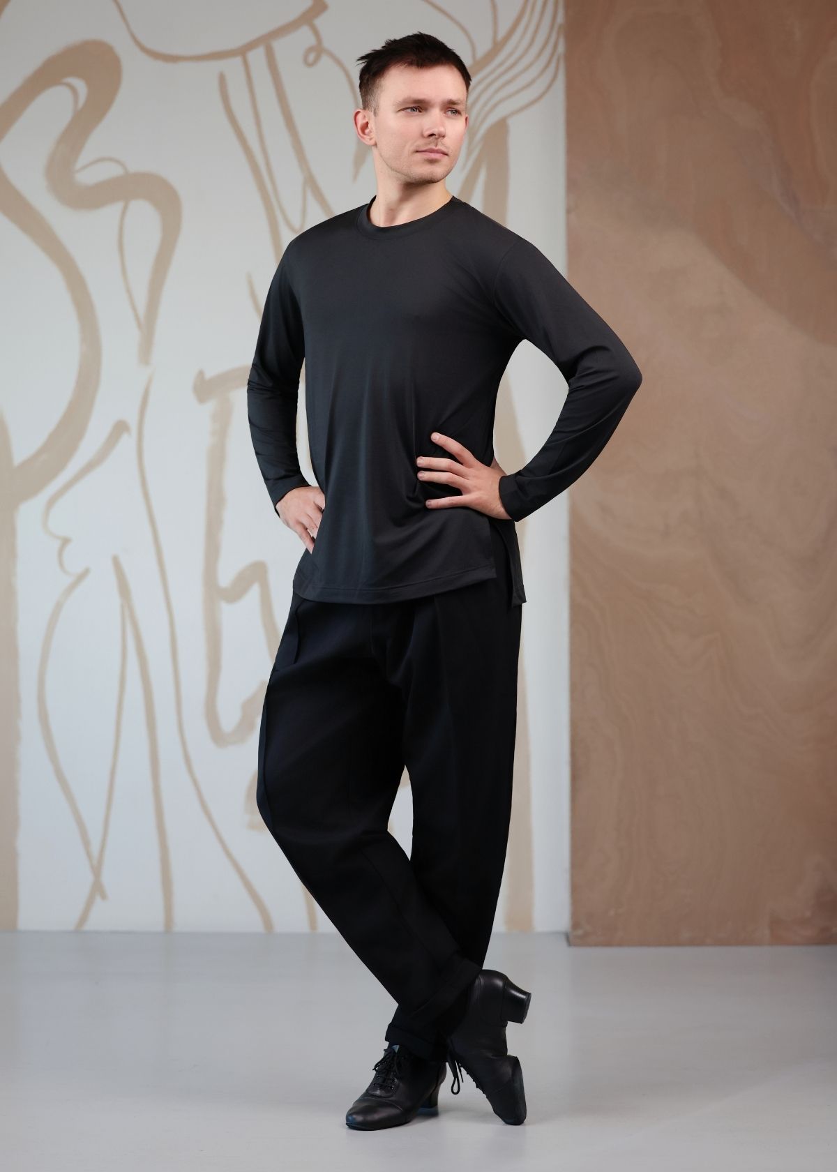 Особливістю моделі є центральна асиметрія крою, яка формує виразну вертикаль і підкреслює пластику корпусу. Бічні розрізи додають свободи рухів, не обтяжують силует і дозволяють тканині природно працювати в динаміці. Лонгслів не сковує кроки, повороти та роботу рук, підходить для тренувального процесу й сценічної практики.