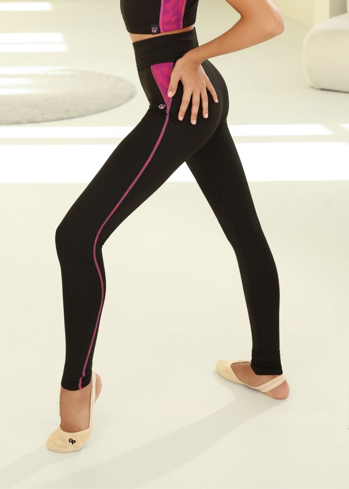 Модель має високу посадку з фіксуючим поясом, який підтримує зону талії під час активного навантаження. Контрастні вигнуті шви візуально подовжують ноги, а вставки з фактурної меланжевої тканини з боків додають силуету об’єму й стилю. Ідеально підходять для гімнастики, танців, фітнесу або розігріву.