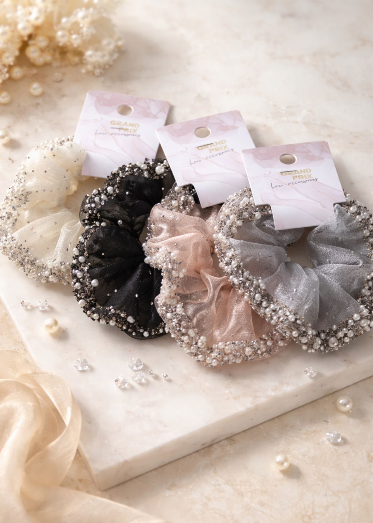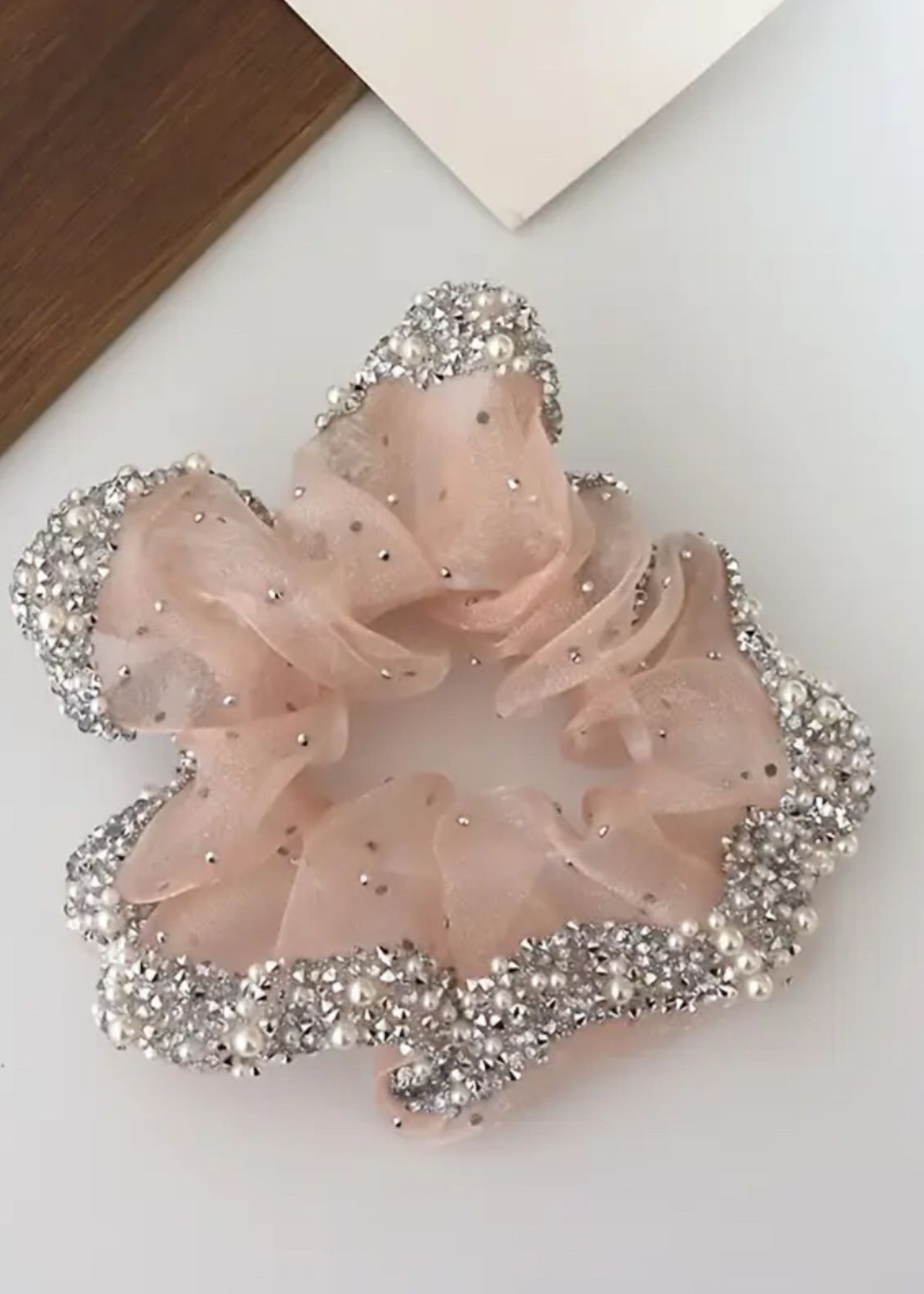 Резинка з перлинами — сценічний аксесуар для фіксації зачіски під час тренувань і виступів. Основа виконана з легкої прозорої тканини типу органзи, сформованої у м’які хвилі, що створюють об’єм без жорсткості. Тканина добре тримає форму, виглядає повітряно та акуратно в зачісці. Край декорований перлинами й дрібними стразами, які ефектно відбивають світло під сценічним освітленням. Резинка м’яко фіксує волосся, не тягне та не пошкоджує його, підходить для пучків, хвостів і сценічних укладок.