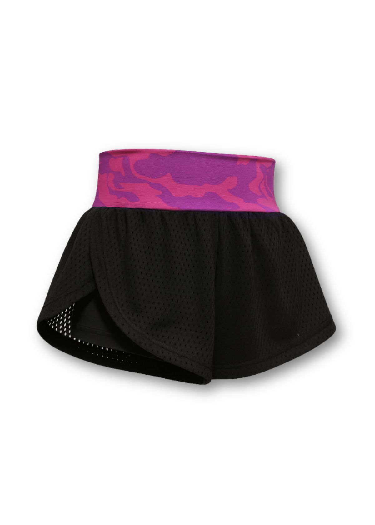 Верхній шар — легка сітчаста спідниця з боковими розрізами, яка додає динаміки й легкості силуету. Така конструкція дозволяє почуватися впевнено під час активних тренувань, не обмежуючи рухів і не відволікаючи увагу.