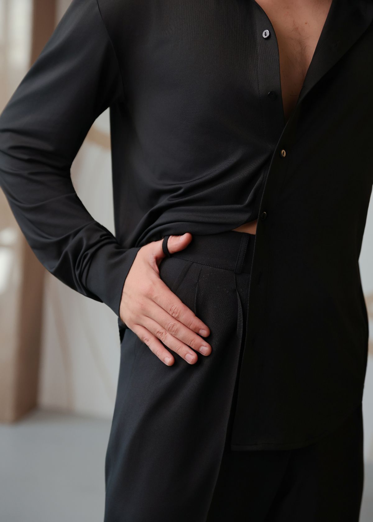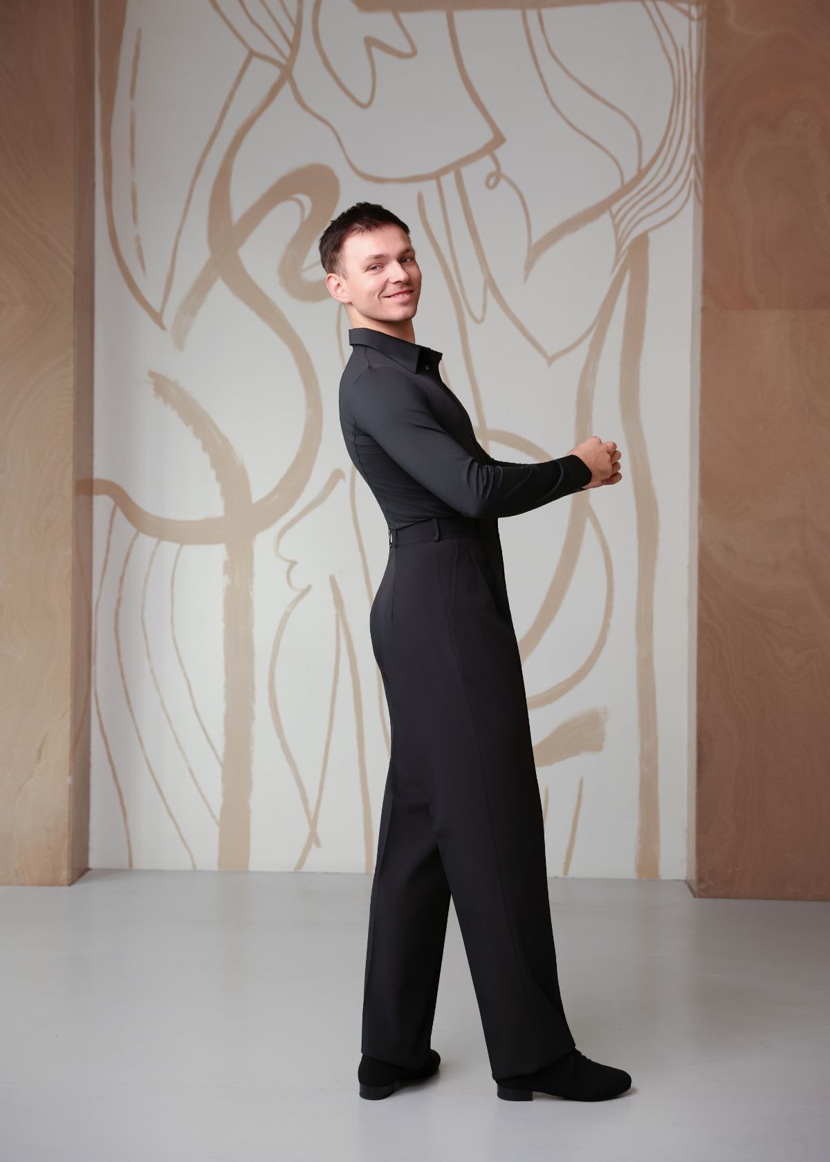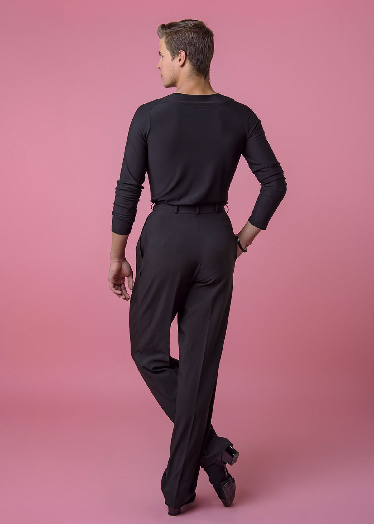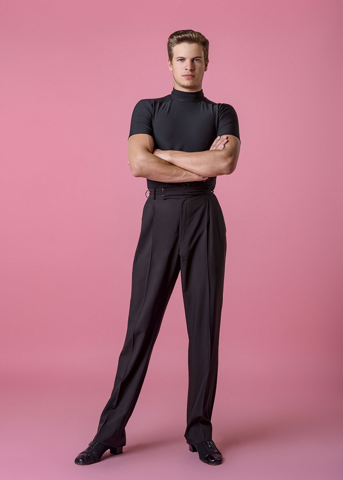 Класичні чоловічі брюки для латинської програми виготовлені з гладкого габардину, що зберігає форму та дарує свободу рухів. Висока посадка і витончений крій створюють візуально стрункий силует. Брюки підходять як для тренувань, так і для виступів.