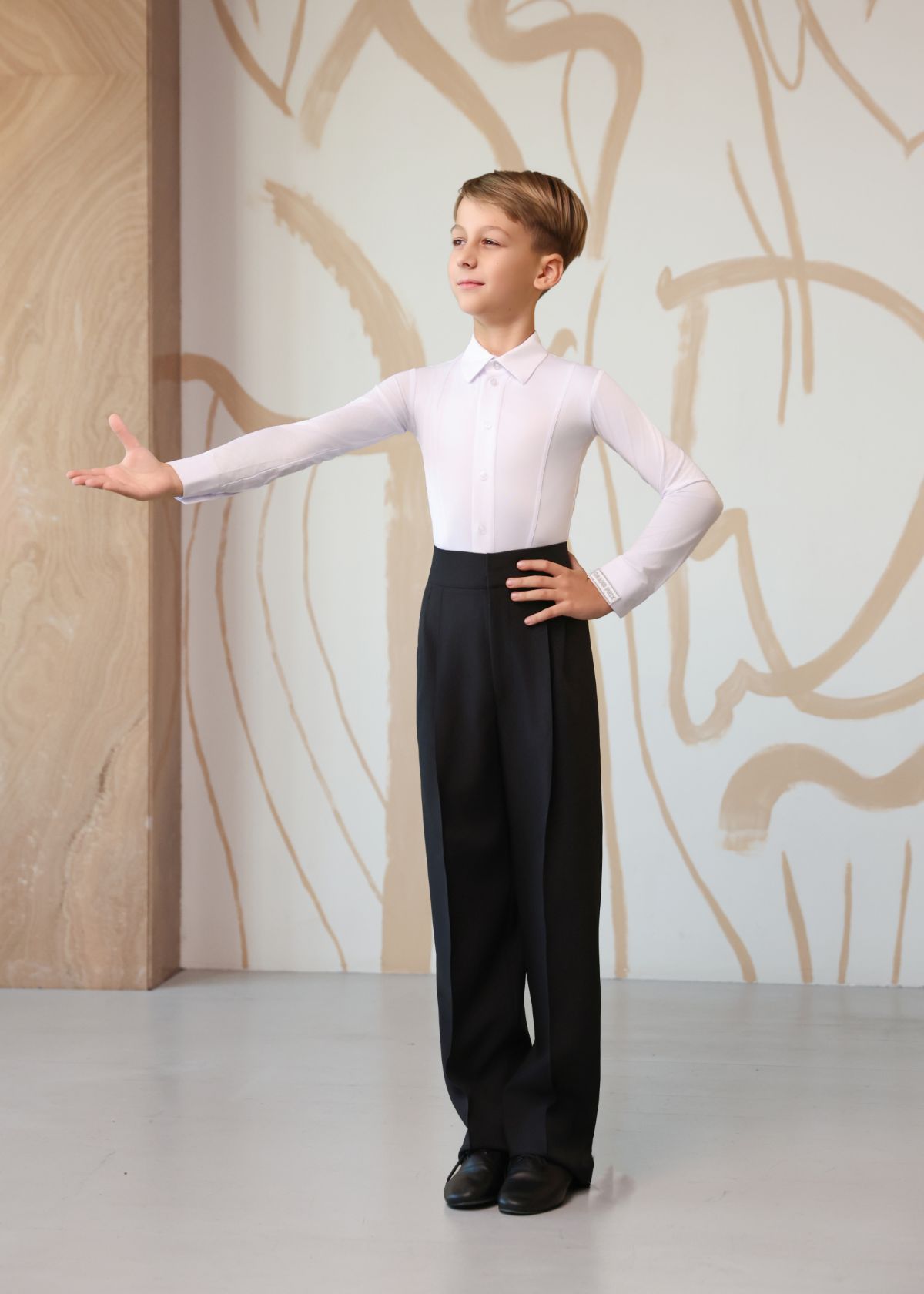 Класична чоловіча сорочка для занять і виступів у латинській програмі. Виконана з м’якого еластичного матеріалу, що забезпечує комфортну посадку та свободу рухів. Застібається на ґудзики по центру, має акуратний комір і довгий рукав. Вишукана базова модель для сценічного образу.