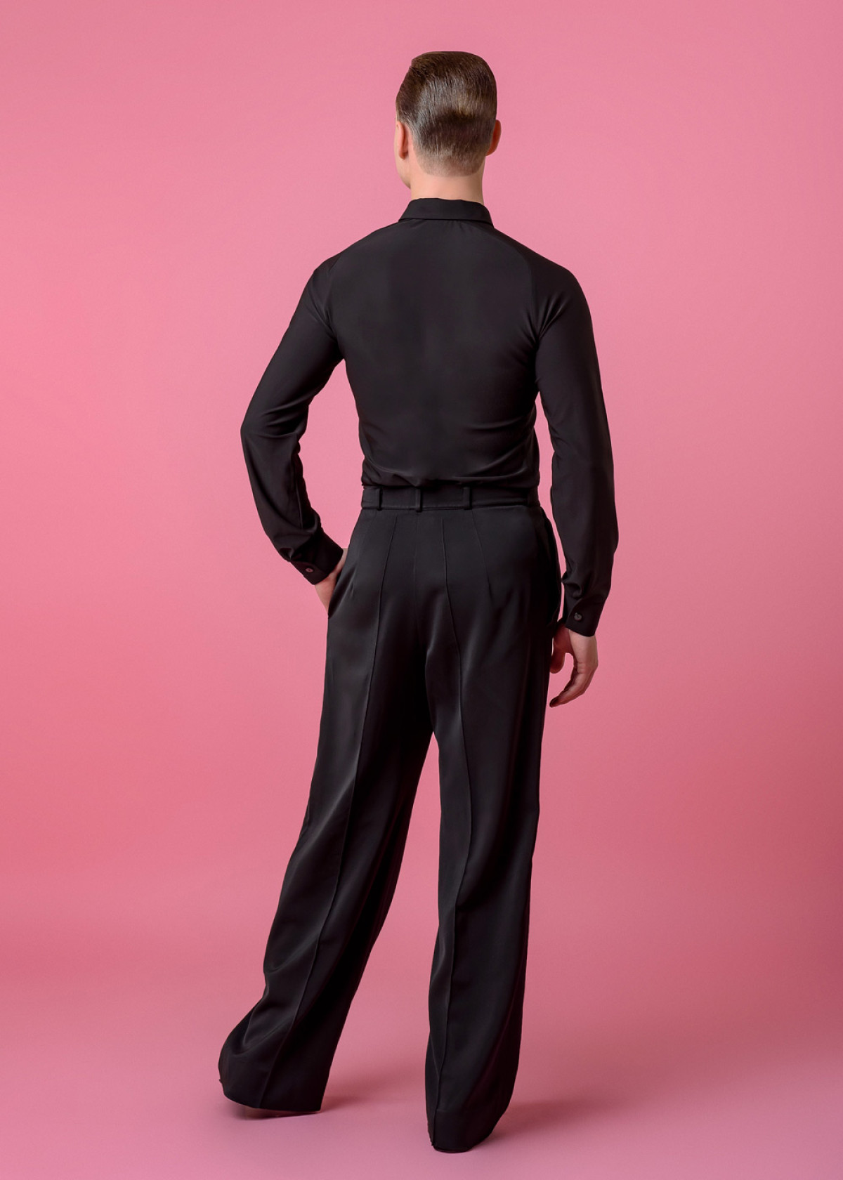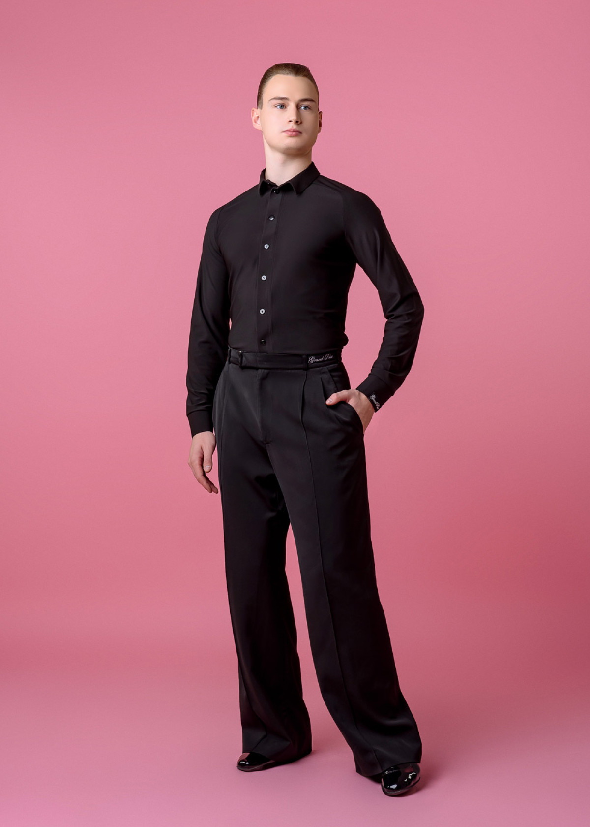 Класична чоловіча сорочка для занять і виступів у латинській програмі. Виконана з м’якого еластичного матеріалу, що забезпечує комфортну посадку та свободу рухів. Застібається на ґудзики по центру, має акуратний комір і довгий рукав. Вишукана базова модель для сценічного образу.