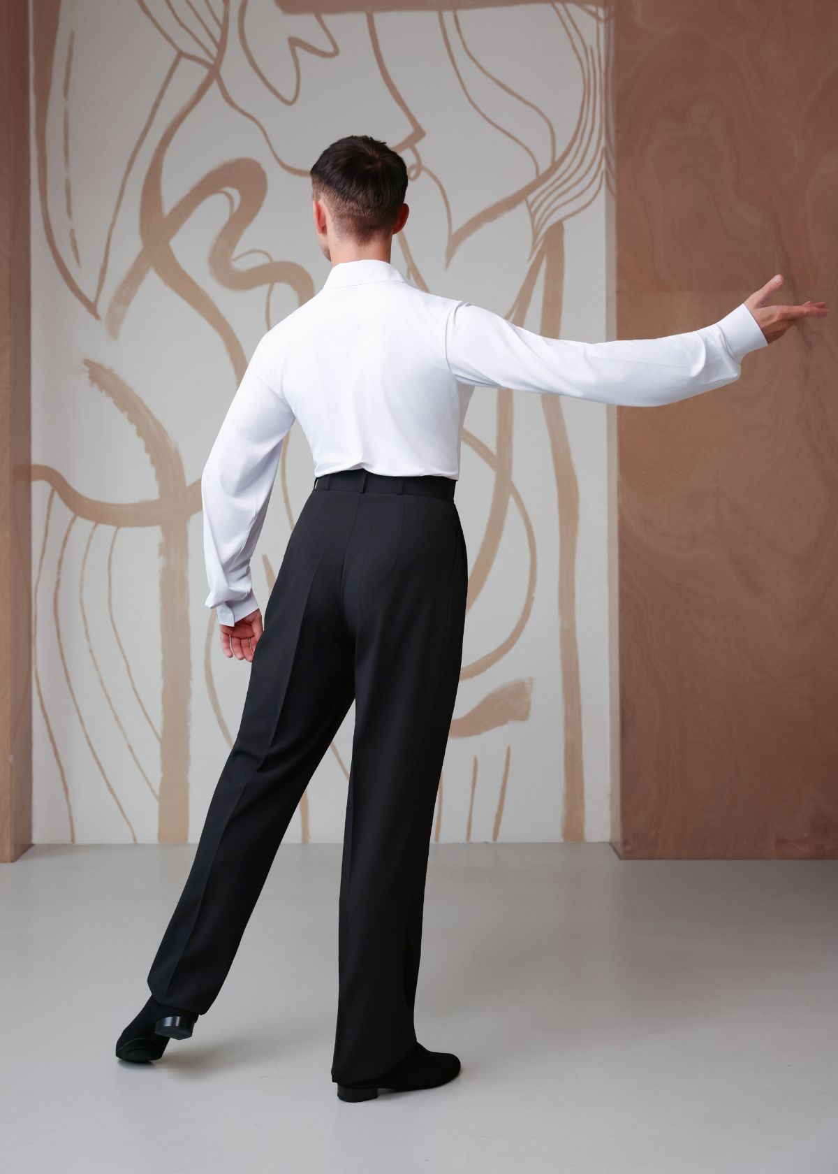 Класична чоловіча сорочка-боді з довгим рукавом, застібається на ґудзики. Приталений крій забезпечує ідеальну посадку та підкреслює лінії тіла танцівника. Відкладний комір додає елегантності, а манжети оздоблені фірмовою нашивкою Grand Prix з вишивкою срібною ниткою.