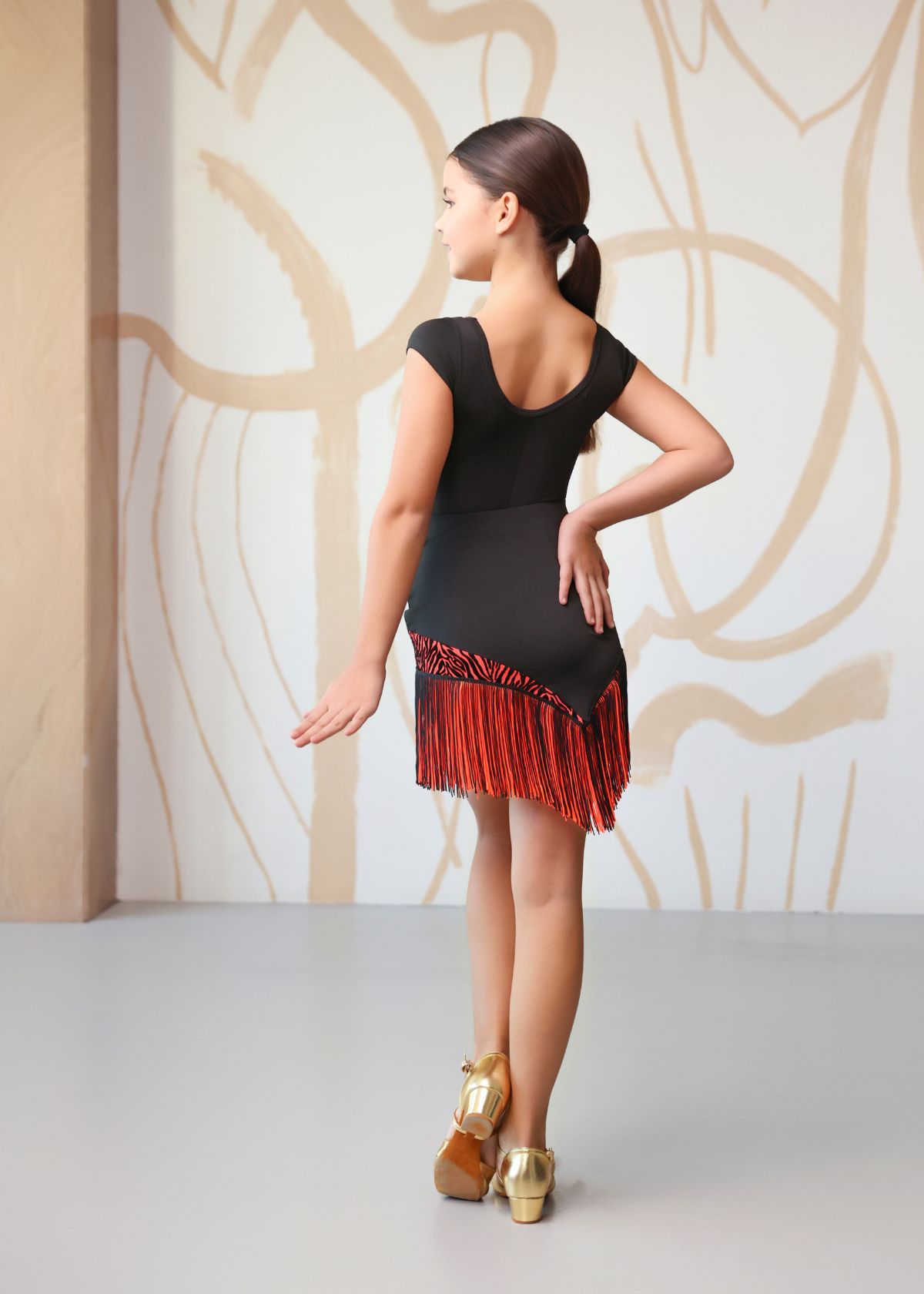 Асиметричний крій із діагональною лінією зрізу створює ефект динаміки навіть у статиці, а коротша передня частина відкриває ногу, підкреслюючи рух у танці. Верхня вставка із сітки з флокованим візерунком додає контрасту, а яскрава бахрома по нижньому краю підсилює ритм і візуальний об’єм під час обертів.