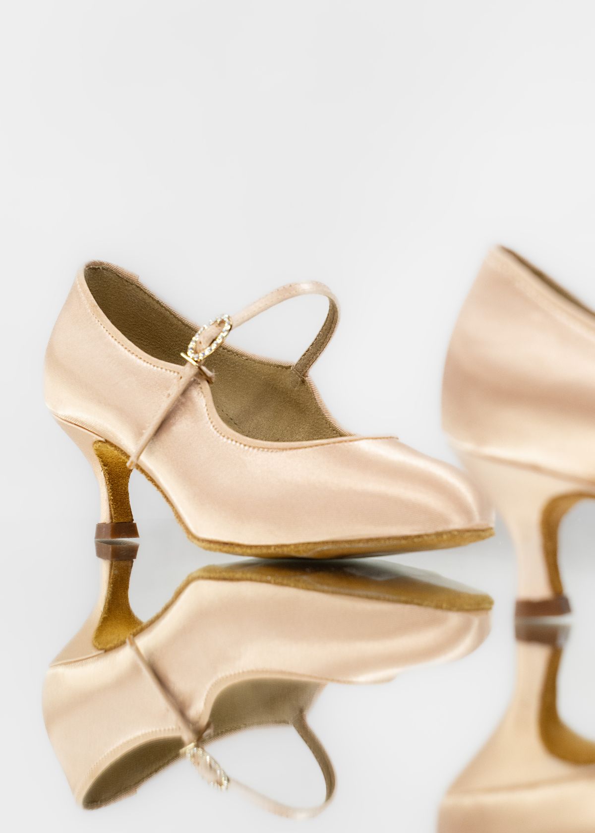 Класична модель жіночих туфель для стандарту, виконана в елегантному сатині ніжно-рожевого кольору. Ця модель поєднує у собі стиль, комфорт та надійну підтримку стопи, що робить її ідеальним вибором для професійних танцівниць.