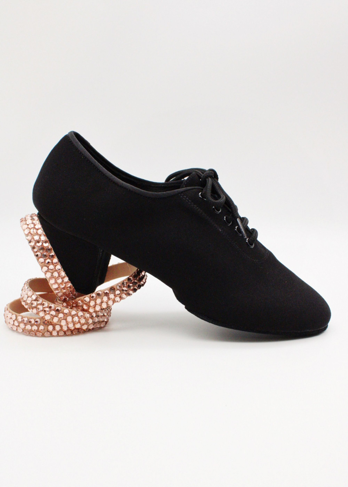 Каблук 5 см, стійкий, із набійкою зі спілку для надійного зчеплення з паркетом. Завдяки короткому супінатору взуття дуже гнучке та повторює всі рухи стопи під час танцю. Шнурівка дозволяє регулювати щільність посадки. У п'яточній частині передбачено м'який підп’ятник для кращої амортизації.