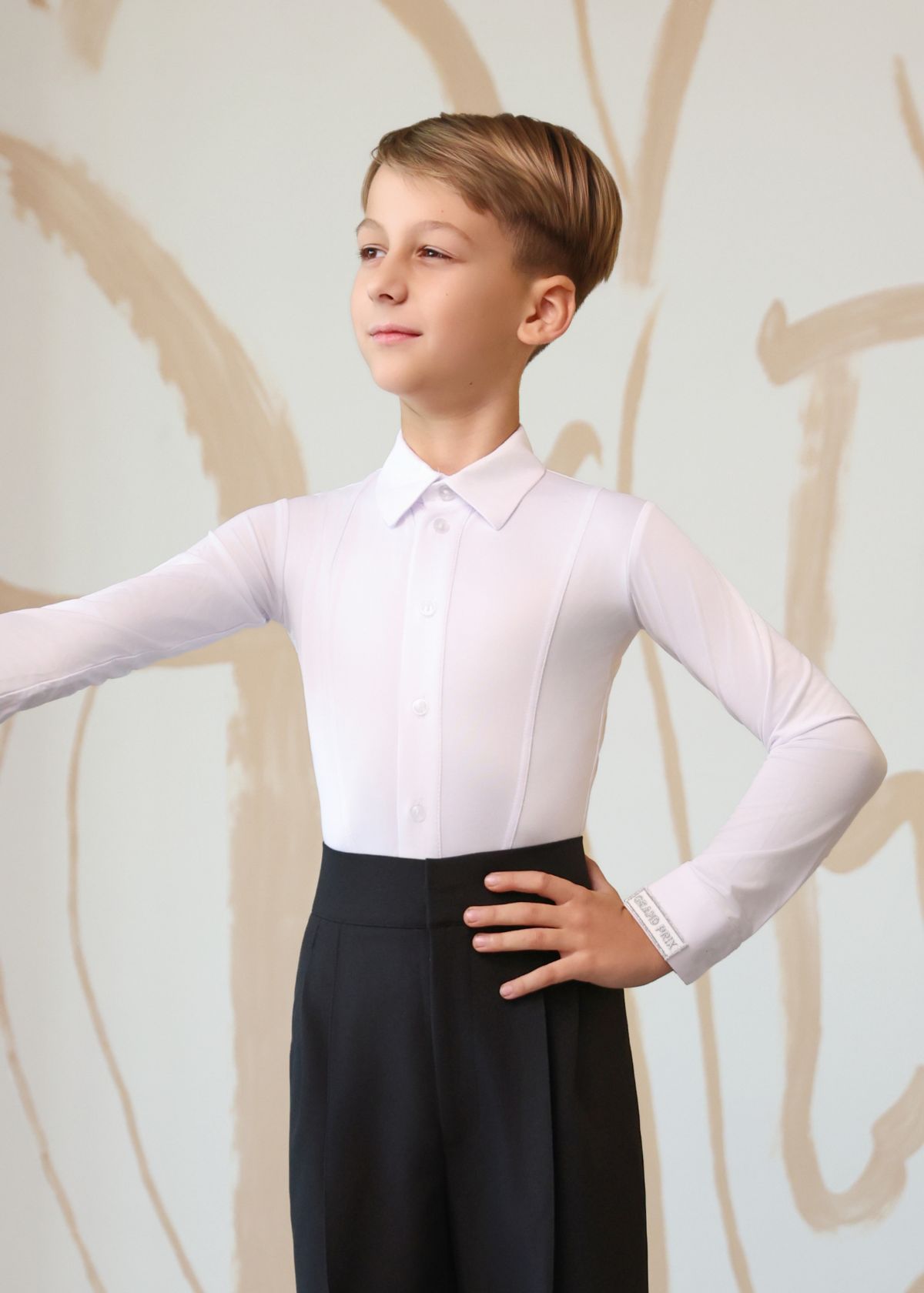 Классическая мужская рубашка для тренировок и выступлений в латинской программе. Мягкий и эластичный материал обеспечивает идеальную посадку и свободу движений. Застёжка на пуговицы по центру, аккуратный воротник и длинный рукав — всё, что нужно для сценического образа.
