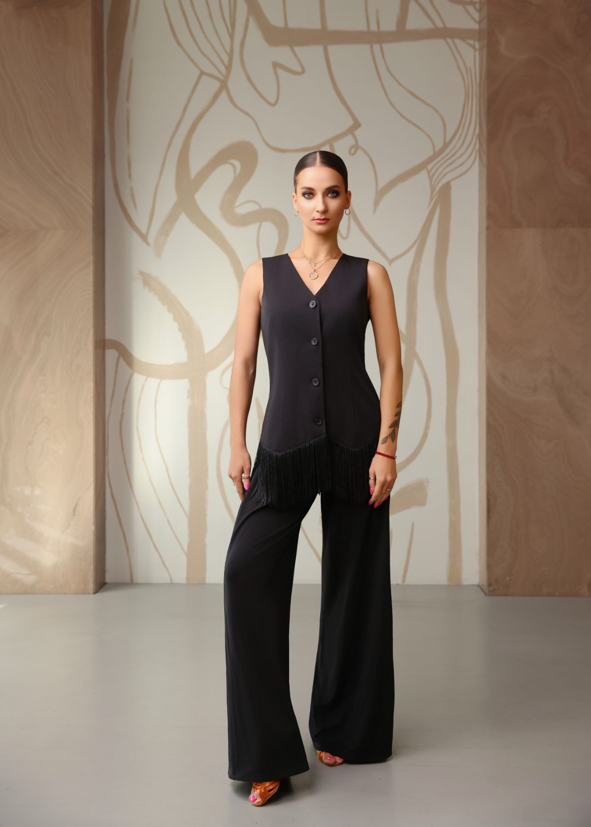 Виконаний із щільного габардину, який добре тримає форму та не мнеться. М’яка бахрома по низу гарно рухається в танці, додаючи сценічності образу. Центральна застібка на ґудзиках та чітка лінія плеча створюють елегантний, впевнений силует.