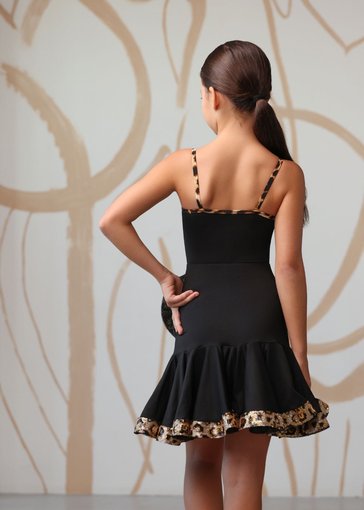 Контрастная отделка пайетками леопардового принта создаёт переливы света, добавляя движению блеск и ритмику.