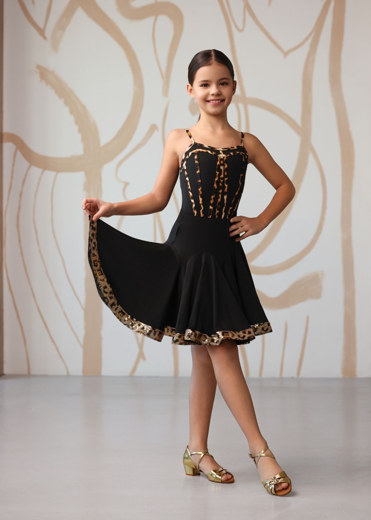 Низ юбки украшен кантом с пайетками леопардового принта, а внутри дополнен жёстким кринолином — он помогает сохранять форму и создаёт эффектную волну во время вращений.